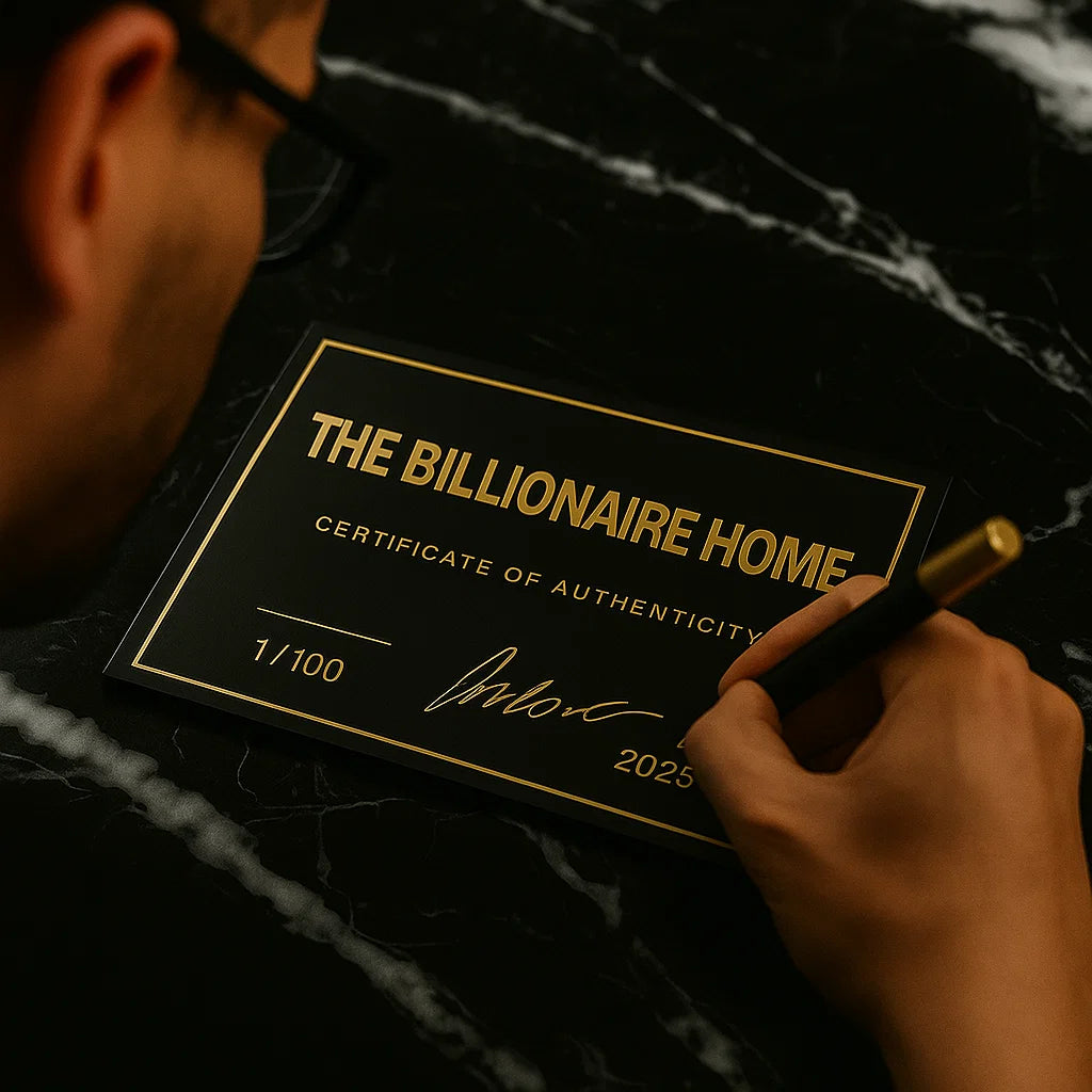 Ce certificat confirme que vous êtes le détenteur d'une édition Collector authentique de The Billionary Home — faisant partie d'une série extrêmement limitée, numérotée et signée par l'Artiste original. Moins de 100 exemplaires existent dans le monde, chacun étant méticuleusement fabriqué sans aucune reproduction à venir.